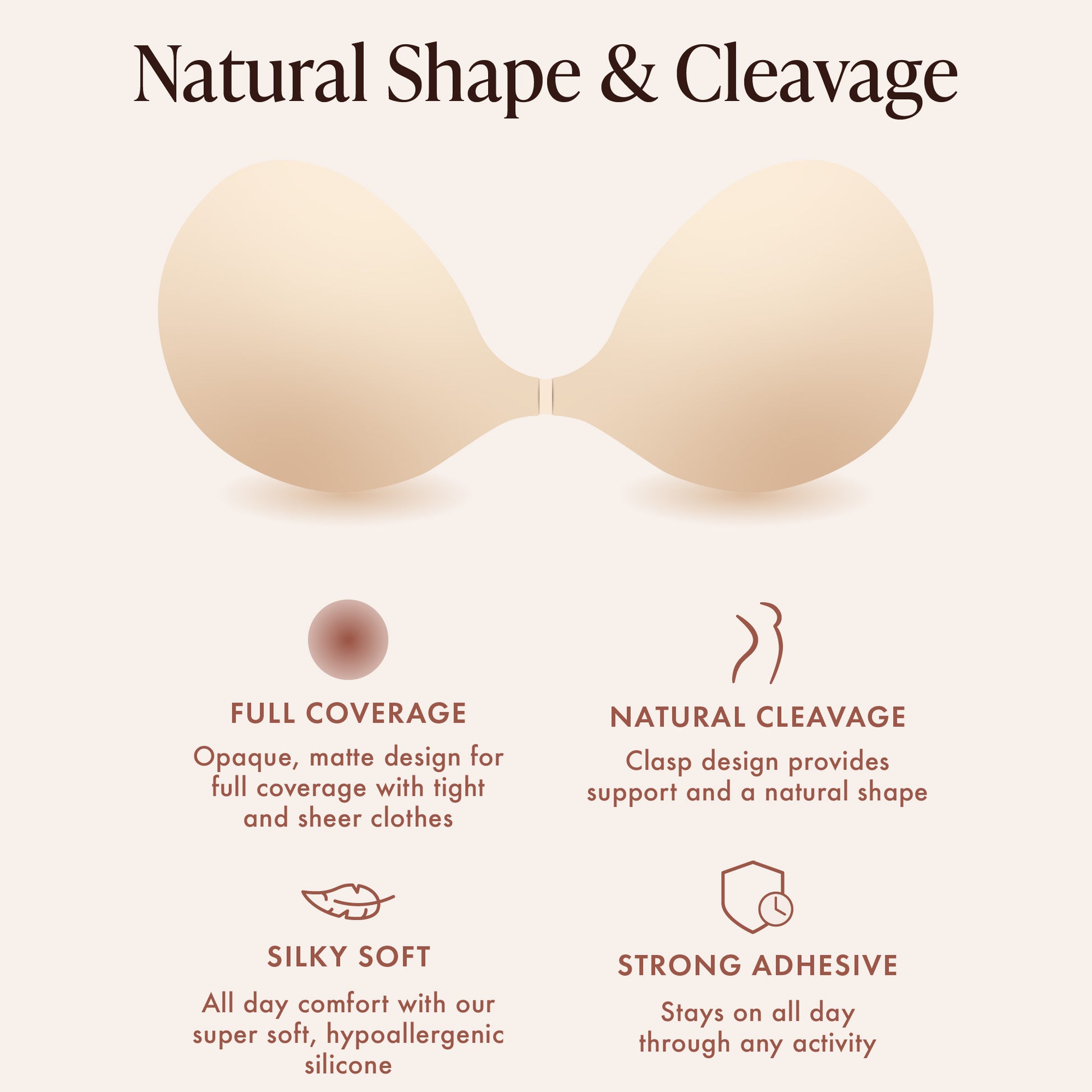 Satin Feel, Uncompromising Support: Our unique silicone has a soft, satiny and full-coverage finish while the clasps in the center provide long lasting support.