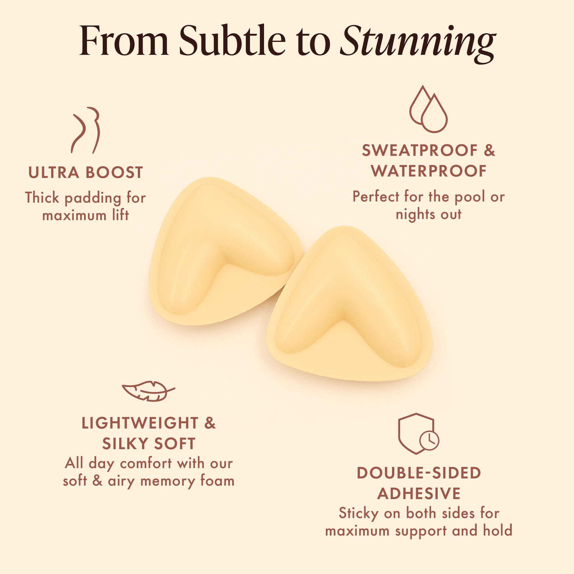 Sweatproof, Waterproof, Ultra-Comfy: Feel confident and comfortable when wearing our sticky inserts. Whether you're out in your favorite clubbing dress or needing a push up bikini top, we've got you covered. Made with ultra-comfy memory foam, you won't even remember you're wearing them.