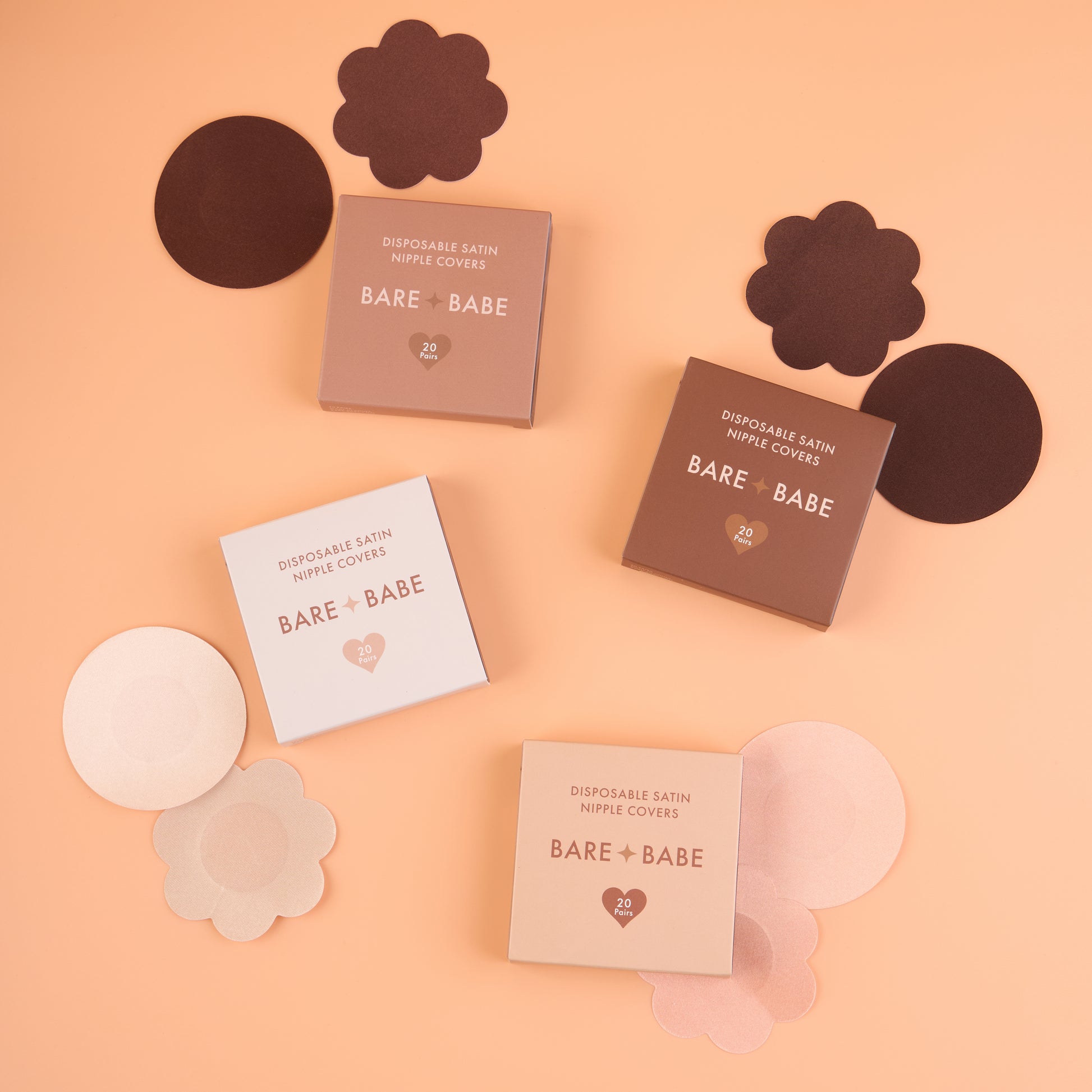 Soft Satin Nipple Pasties in 4 beautiful shades to match your skin tone. Made from 100% medical-grade materials, these nipple cover stickers are hypoallergenic and perfect for sensitive skin. Comes with 20 pieces of the round shape and 20 pieces of the flower shape (10 Pairs of each).